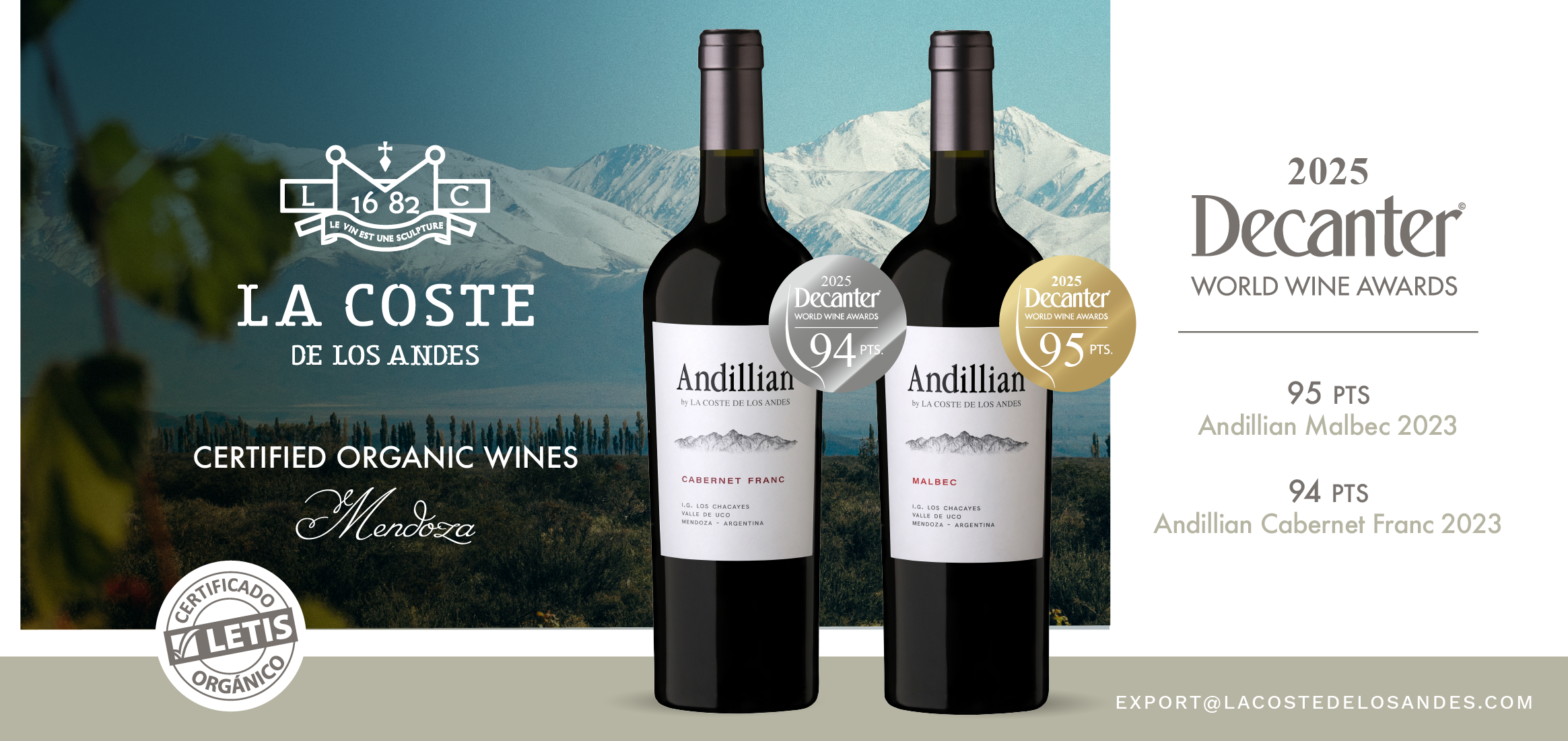 La altitud del Valle de Uco vuelve a conquistar paladares internacionales. Esta vez, de la mano del proyecto argentino La Coste de Los Andes liderado por el enólogo mendocino Lucas Gimenez, que acaba de recibir puntajes destacados en los prestigiosos Decanter World Wine Awards 2025. Tres etiquetas de la bodega —una insignia y dos líneas hermanas bajo el nombre Andillian Wines — fueron distinguidas por su elegancia, precisión y carácter, confirmando el potencial del terroir de Los Chacayes como una de las joyas del mapa vitivinícola mundial.