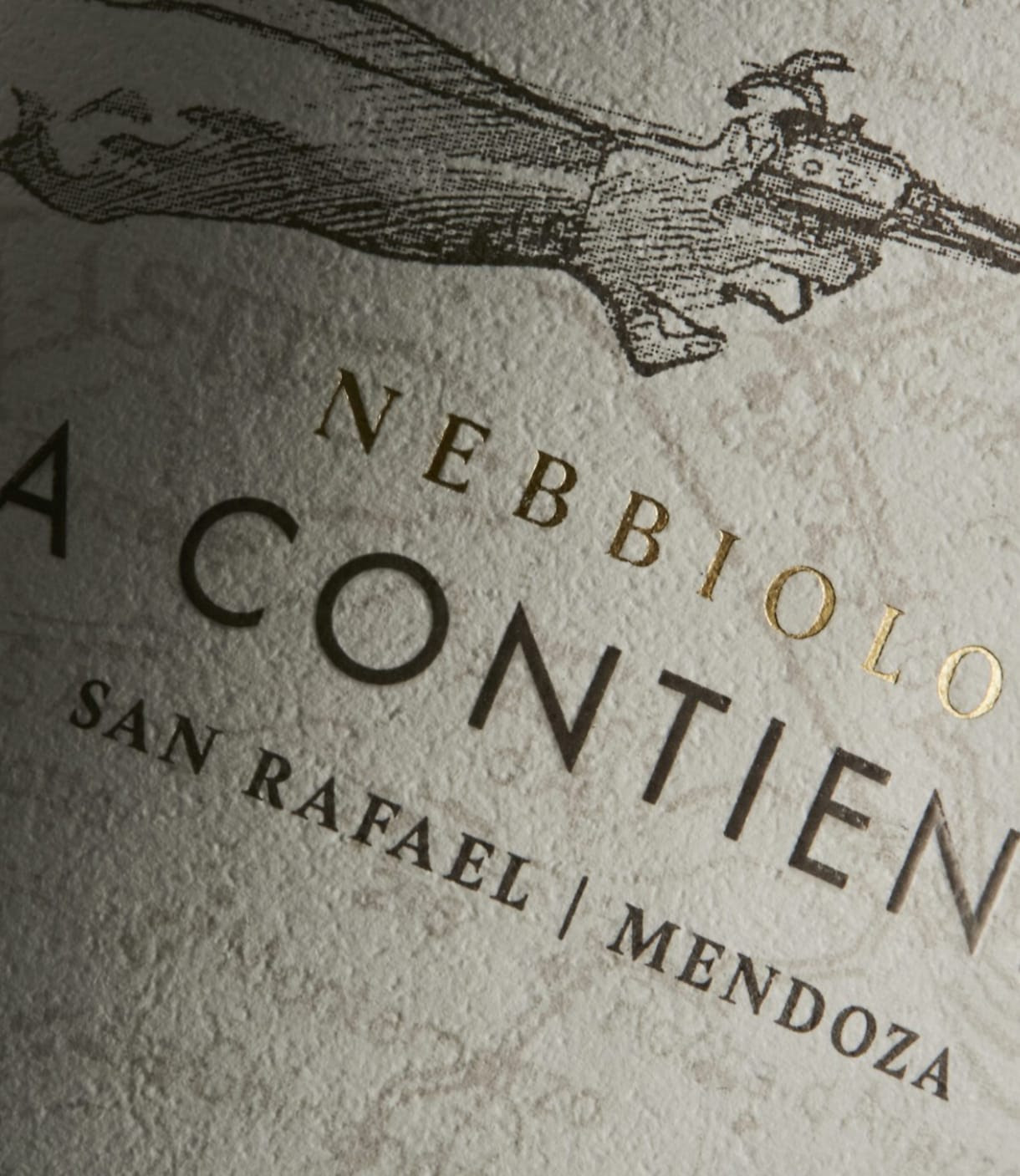 La etiqueta de La Contienda Nebbiolo, completa la obra de arte que empezó con los otros varietales de la línea.